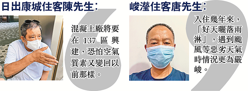 已退休的他續指,之前做貿易生意,現時年紀大最擔心身體健康,雖然將軍澳垃圾堆填區已關閉,臭味已消失,但知道混凝土廠將在137區興建,恐怕空氣質素又變回以前那樣。他也提到日出康城最大的「特色」是幾乎幢幢樓都高過60層,是一個人口高度密集的地區,希望政府善用137區土地作更好的發展,例如興建公共設施,滿足居民需要。