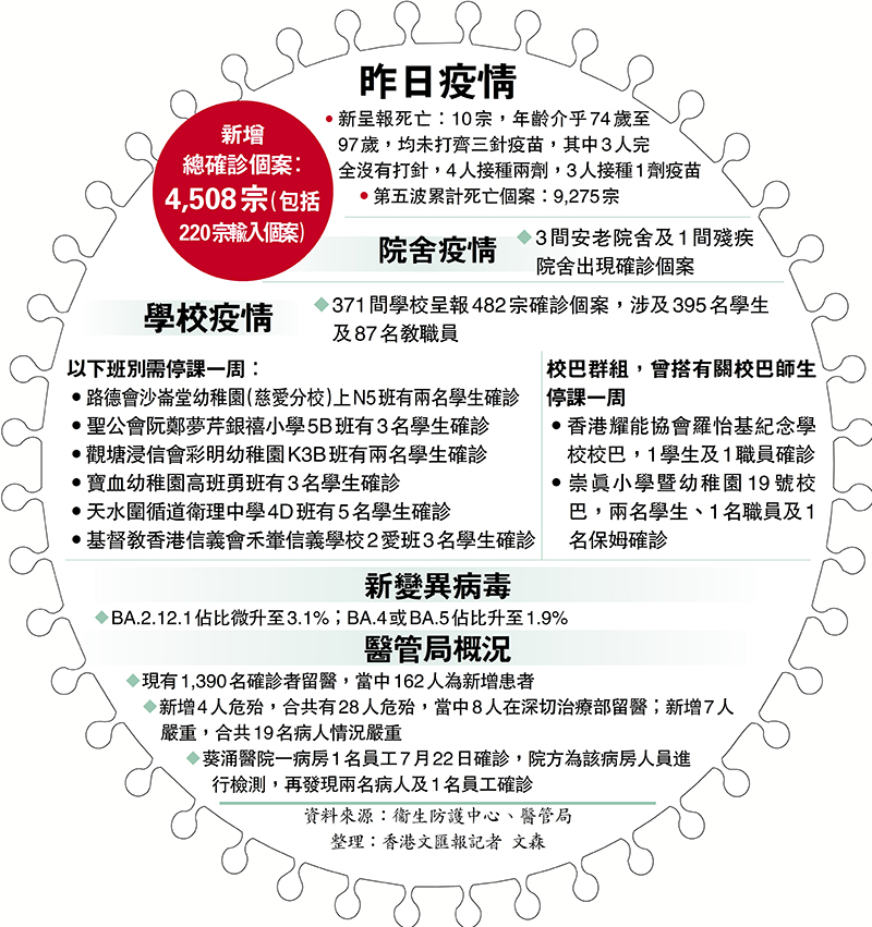 香港新冠肺炎確診及死亡宗數昨日俱升至3個月以來高位,單日新增4,508宗確診個案,包括220宗輸入個案,單日死亡呈報個案重上雙位數,再多10名確診長者離世,死者均未打齊三針疫苗,當中3人一針都未打。衞生防護中心表示,第五波疫情以來逾9,000名離世確診者當中,打齊三針的人數比例不足1%,呼籲長者、有長期病患等高風險人士盡早打齊疫苗。醫管局亦呼籲市民一旦確診需立即求診,以便及時獲處方新冠口服藥。