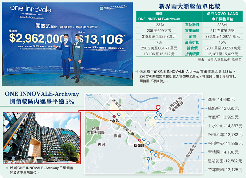 恒基物業代理營業(一)部總經理林達民形容,ONE INNOVALE-Archway首批單位開價屬「忍讓價」,比同區逸峯有約5%至10%折讓,當中91%單位折實價低於500萬元,具有競爭力,加推單位備有加價空間。他指售價已考慮加息及樓盤前景等因素,亦參考粉嶺上水二手呎價及近期其他區份新盤售價,並提供85%一按建築期付款辦法,令買家支付較少首期便可上車。