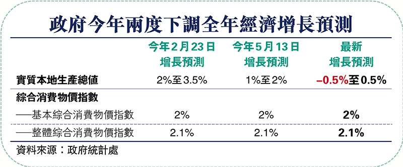 考慮到上半年經濟表現遜預期,以及環球經濟前景急劇惡化,政府下調本港全年GDP增長預測,由5月時覆檢的增長1%至向下修訂至 -0.5%至0.5%。這是政府過去3個月內第二度下調預測。政府在今年2月時,曾預測全年GDP增長2%至3.5%。
