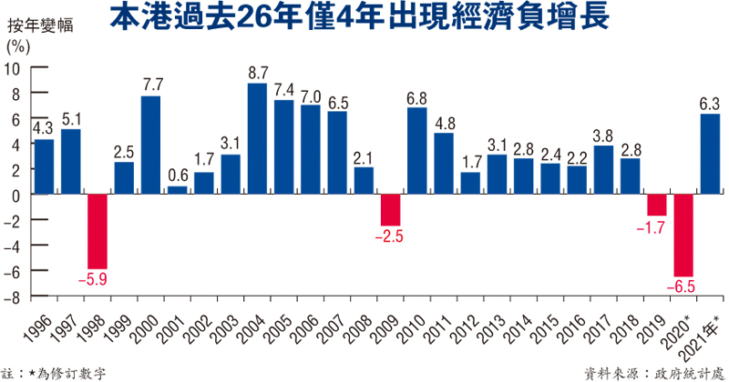 政府最新料今年GDP或負增長0.5%,翻查統計處資料,本港過去26年僅4年出現負增長,包括1998年、2009年、2019年及2020年,分別為-5.9%、-2.5%、-1.7%及-6.5%。