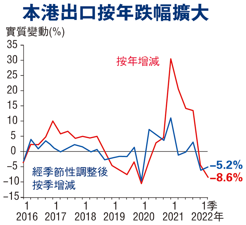 政府昨公布本地生產總值(GDP)第二季修訂數字,在第一季按年收縮3.9%後,第二季跌幅收窄至1.3%。經季節性調整後,第二季GDP按季回升1%。政府指出,第二季香港經濟整體上有改善,但改善程度較預期弱。環球需求轉弱以及跨境運輸持續受干擾,嚴重拖累出口表現,整體貨物出口在第二季跌幅擴大至8.6%。同時,本地經濟活動略見恢復,但動力在季度後期回軟,因疫情有反彈,美國加息亦影響消費者信心,以及環球金融狀況收緊。