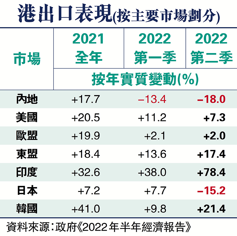 展望未來,政府認為,外圍環境顯著惡化將在今年餘下時間嚴重影響香港的出口表現。儘管預期內地經濟復甦應能抵消部分影響,但先進經濟體通脹高企,主要央行因而大幅收緊貨幣政策,將進一步削弱環球增長動力。而借貸成本上升,也可能影響企業的投資意慾。同時,環球疫情演變、地緣政治局勢緊張等風險因素,亦須密切留意。
