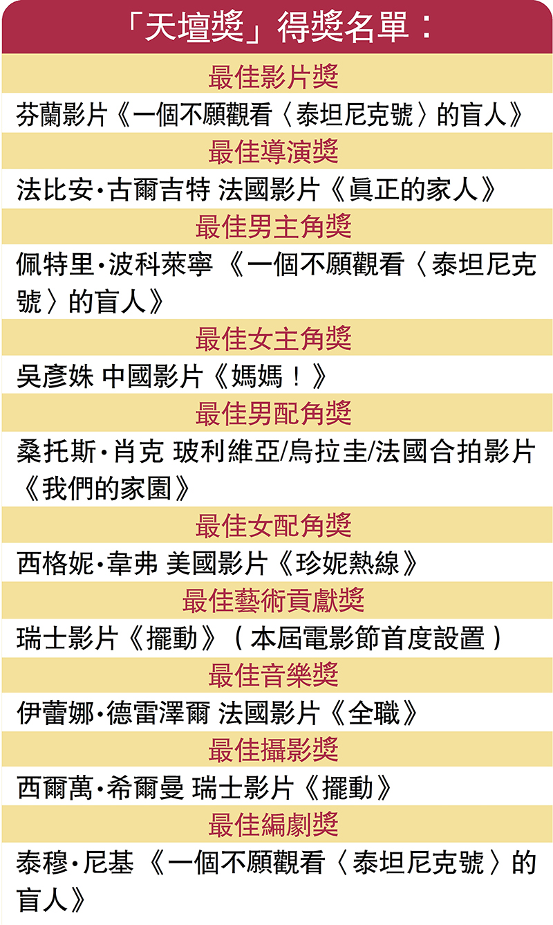 香港文匯報訊(記者 馬曉芳、實習記者 沈冠喬 北京報道)第十二屆北京國際電影節(北影節)昨日閉幕,並隆重揭曉「天壇獎」十大獎項。84歲吳彥姝憑藉在電影《媽媽!》中教科書級別的演出打動評委獲最佳女主角,李雪健則榮獲北影節紀念獎盃。頒獎典禮也因吳彥姝、李雪健兩位獲獎人增添諸多感人場景,吳彥姝與奚美娟攜手致謝,深情表示:「這是對中老年演員極大的鼓勵。」曾身患重病仍不放棄表演的李雪健在得獎後謙虛致謝「我沾了光了」,獲得現場嘉賓起立鼓掌致敬。本屆「天壇獎」,芬蘭影片《一個不願觀看〈泰坦尼克號〉的盲人》成為最大贏家,分別榮獲最佳編劇、最佳男主角、最佳影片三項大獎。
