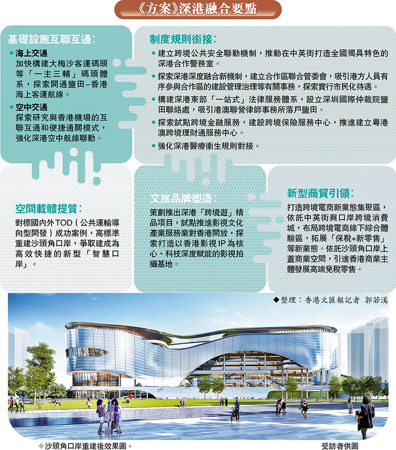 為提升口岸和碼頭的深港客運樞紐功能,織密合作區對外公路和軌道交通網絡,深圳正全力推進沙頭角口岸重建工程,預計今年年底開工。沙頭角口岸重建後定位為純旅檢口岸,近期按照4萬人次/日通關能力進行建設,預留遠期通關能力10萬人次/日改造空間,由深方統籌深港口岸建設,以類似西九龍站口岸和新皇崗口岸「三維空間」的方式劃定港方管轄區、將相關物業提供港方使用,而土地和物業的所有權仍由深方持有。
