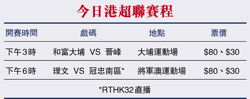 齊在「2022至23年度中銀人壽香港超級聯賽」首周賽事贏波的理文及冠忠南區,今日傍晚會師將軍澳運動場合演榜首大戰,後者的史提芬彭利拿、謝朗軒及劉學銘近季都曾効力理文,今日組成「復仇者聯盟」倒戈相向,誓要搶分力保榜首位置。同日下午和富大埔返回主場出師,迎戰新一季首度亮相的晉峰,只要保持去仗賽和東方龍獅的表現,形勢上可以「坐和望贏」。