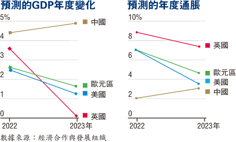 據經濟合作與發展組織(OECD)的資料,明年英國可能成為七國集團(G7)中經濟增速最低、通脹水平最高的國家,預測英國經濟明年錄得零增長,通脹率料達到7.4%,相比美國經濟料增長1.2%及通脹率約為3.5%,英國的情況惡劣得多。英國智庫「決議基金會」稱,若英政府不作出重大干預,在能源價格上漲和工資疲軟的夾擊下,到2024年,英國家庭平均可支配收入每年將下降約3,000英鎊(約2.72萬港元),將是一個世紀以來生活水平降幅最大的一次。