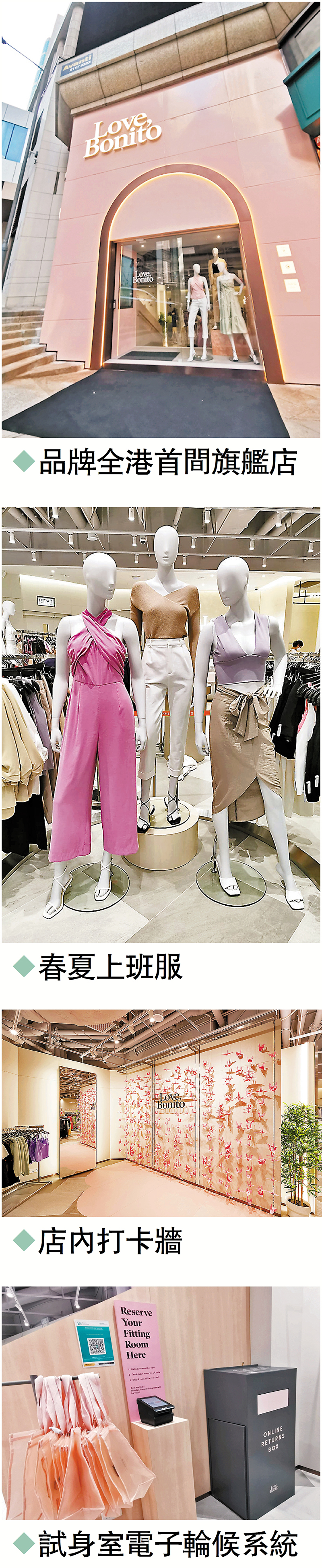 東南亞跨渠道銷售女裝品牌Love, Bonito全港首間旗艦店早前開幕,品牌主打亞洲人身形剪裁設計,佔地超過二千呎,寬闊空間展示品牌多個不同系列產品。其裝潢設計柔和舒適,特意打造Instagrammable打卡空間,同時亦仿效新加坡總店,引入試身室電子輪候系統,有效縮短試身等候時間,務求帶來全方位貼心購物體驗。