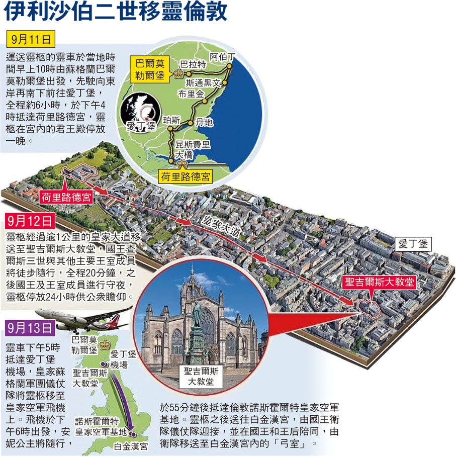 英女王的國葬將於本月19日舉行,移靈儀式昨日正式展開,靈柩昨日移至蘇格蘭首府愛丁堡,大批民眾沿途悼念及送別。靈柩明日會移至倫敦,停放在西敏宮供公眾瞻仰。