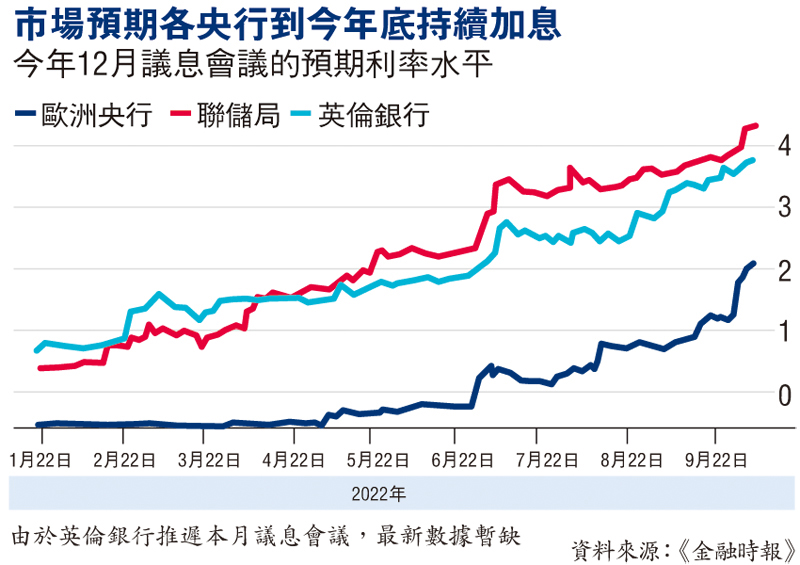 市場人士憂慮各國央行的加息步伐不會在短期內剎停,聯儲局官員已連番強調預計明年不會減息,聯邦基準利率目標區間未來數月或推高至4厘。分析認為此舉表明局方相信,即使加息導致經濟重創,也不能過快「鬆綁」,否則隨時令通脹反彈。
