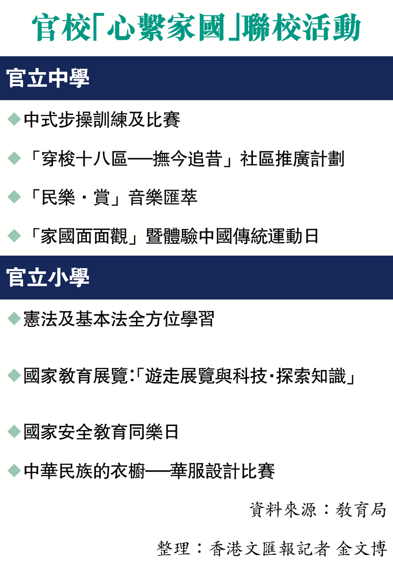 教育局在回覆香港文匯報查詢時表示,「心繫家國」聯校活動豐富多元,包括中式步操比賽、民族音樂匯演、運動日,以及各類比賽和展覽等(見表),部分會配合重要日子,包括國慶日、國家憲法日、基本法頒布紀念日、全民國家安全教育日及香港特別行政區成立周年紀念日等,讓學生在慶祝或紀念這些重要日子時,進一步深化愛國愛家的情懷。