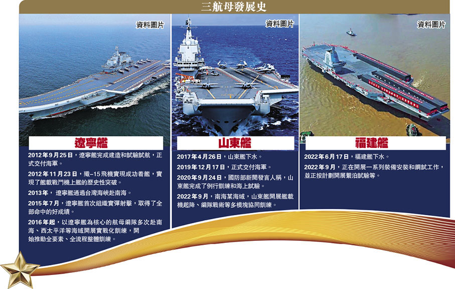 十年前的2012年9月25日,中國首艘航母遼寧艦交付海軍,中國航母時代正式啟航。之後,2019年12月,中國第一艘國產航母山東艦入列。今年6月,中國自主設計建造的首艘彈射型航母福建艦下水。這兩天,福建艦正在開展一系列裝備安裝和調試工作,相關試驗任務也在同步推進。砥礪十載,遼寧艦逐步建立起航母編隊綜合攻防體系,形成了包括遠海作戰運用的系列戰法,實現了從試驗訓練平台到備戰打仗先鋒的華麗轉身。專家表示,十年間,從遼寧艦到山東艦到福建艦,中國航母實現了從無到有、從改裝到國產、從滑躍到彈射的升級跨越,創造了令人矚目的中國速度,正式邁入了三航母時代。 ◆香港文匯報記者 葛沖 北京報道
