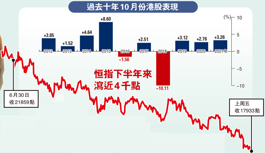美國今年3月起開啟此輪加息周期,自6月起更連續三次加息0.75厘,聯儲局最新更上調了對利率的預測,將今年利率中位數由3.4厘,大幅上調至4.6厘。有投行指出,聯儲局「暴力加息」導致美元獨強,港股及新興市場不斷捱沽,連帶美股也難獨善其身。全球最大對沖基金橋水創始人達利奧指出,美國已顯示出典型衰退徵兆,預料未來兩年經濟將惡化,美股將跌兩成。香港銀行上周也近4年來首度上調最優惠利率(P),10月份有所謂「股災月」之稱,摩根士丹利預計,10月港股或將出現「投降式拋售」,「最悲觀情境」恒指會下試17,000點,建議投資者應「保持防守,直到投降式拋售的發生」。◆香港文匯報記者 周紹基