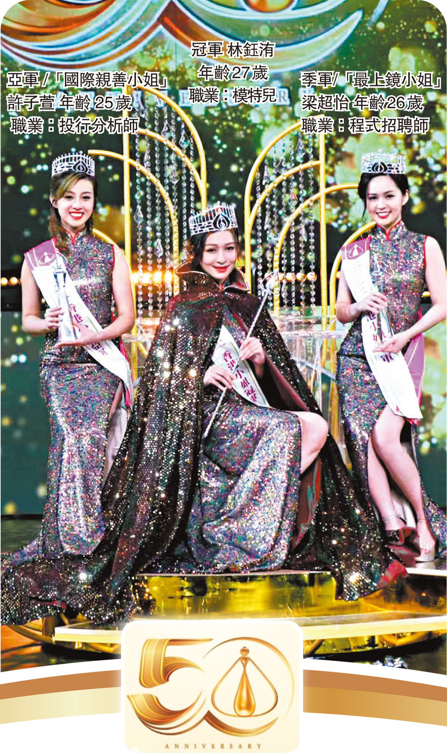 為紀念港姐競選50周年,TVB在節目編排上凸顯追尋夢想是任何年代都需要,起用三梯隊的12位司儀,兩屆《聲夢》新星一齊表演「追夢之旅」, 也請來慧妍雅集一班師姐分享美麗回憶和成功經驗,並對新一屆當選港姐送上祝福。昨晚今屆19位佳麗特別穿上20年前多屆港姐冠軍所穿着過的晚裝,除了是傳承意義外也令人覺得參選港姐佳麗的身材一直都極標準。大會又選擇以往港姐在考智慧的問答環節中曾答過的問題讓今屆參選者重答一次,象徵香港小姐美貌與智慧並重的精神永遠傳承下去。