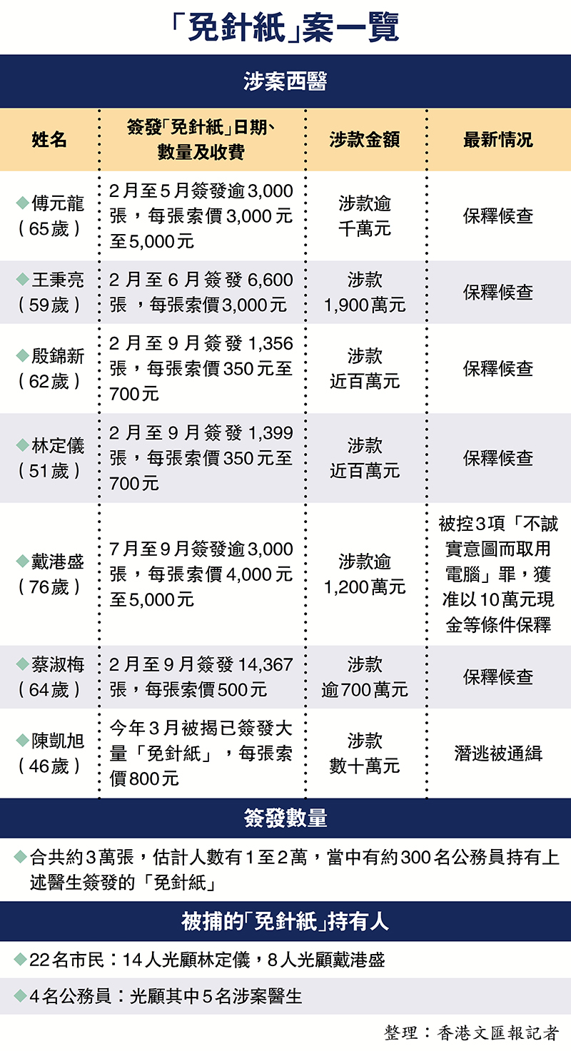 昨日被捕的4名女公務員,包括教育局廣東道官立小學的45歲教師陳×雯,其餘3人為社會福利署職員,分別為25歲姓關二級會計主任,以及48歲姓李及42歲姓鍾社工。據了解,她們手上的「免針紙」涉及上月被捕的其中5名醫生,其中3人每人至少光顧兩名不同涉案醫生買「免針紙」,餘下1人持有兩張由同一名涉案醫生發出的「免針紙」,各人支付500至2,500元不等。