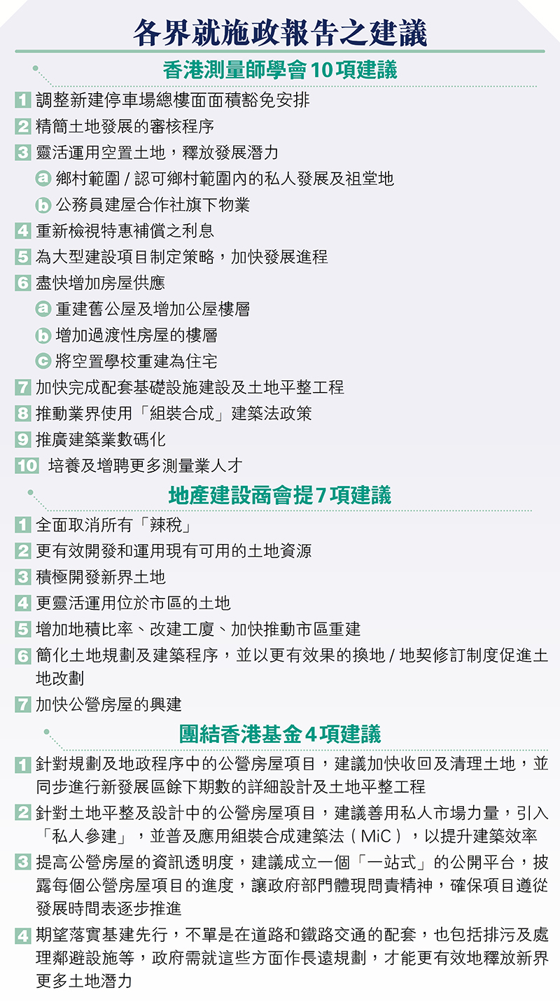 新一份施政報告公布在即,房策方面估計會聚焦如何「提速、提效、提量」。近日有市場消息指,政府或會引入「新版」私人參建公營房屋,由發展商提供用地及負責賣樓,以縮短輪候時間及賣樓速度。業界亦紛紛提出意見,有智庫建議成立一個公開平台,披露每個公營房屋項目的進度,讓政府部門體現問責精神,確保項目發展進度,又建議公營房屋普及使用「組裝合成」建築法(MiC)。地產界則普遍提議政府「減辣」穩定樓市,及增加地積比率、簡化土地規劃及建築程序等,以提速增加房屋供應。