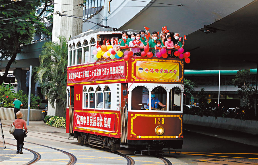 香港文匯報訊 香港電車職工會昨日組織逾20名市民和孩子乘坐電車在港島巡遊,慶祝中共二十大勝利召開。該會常務副主席葉永勝表示,電車會在下午時間在西環至銅鑼灣一帶巡遊,車上特地張貼了「熱烈慶祝中國共產黨第二十次全國代表大會勝利召開」與「實現中華民族偉大復興」的橫幅,希望香港能有更多市民知道中共二十大勝利召開的盛況,了解並認識祖國近年來的發展成就,融入國家發展大局和投身大灣區建設,增加國民身份認同感。