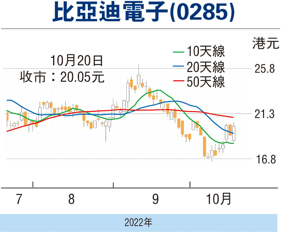 根據資料顯示,南向資金周三(19日)再度增持比亞迪電子44.85萬股,連續5日增持。目前港股通共持有比亞迪電子16,746.42萬股,佔流通股7.42%。該股10月12日退至16.54元(港元,下同)獲支持後展開反彈,股價昨曾高見20.4元,低位回升了23%。該股收報20.05元,升0.91元或4.75%。可候股價走勢改善跟進,中線上望目標仍看上月初高位的26.2元,惟失守昨日低位支持的18.5元則止蝕。