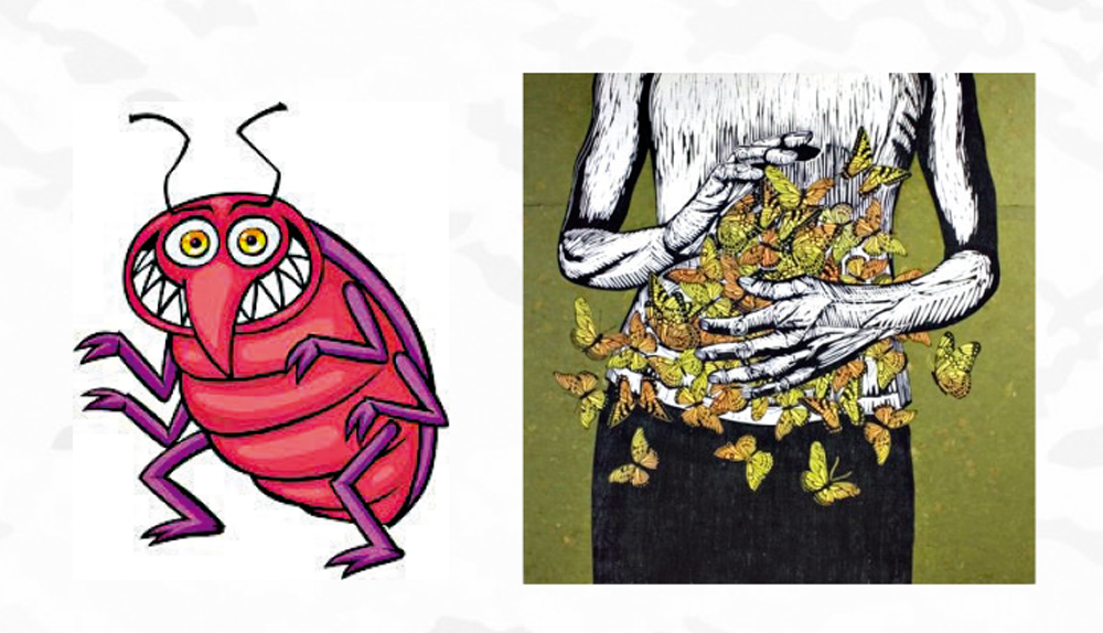 5.To have butterflies in one's stomach,在肚中的蝴蝶看似奇怪,實質描述對於某事情或是將會發生的事情非常緊張。正確例子: