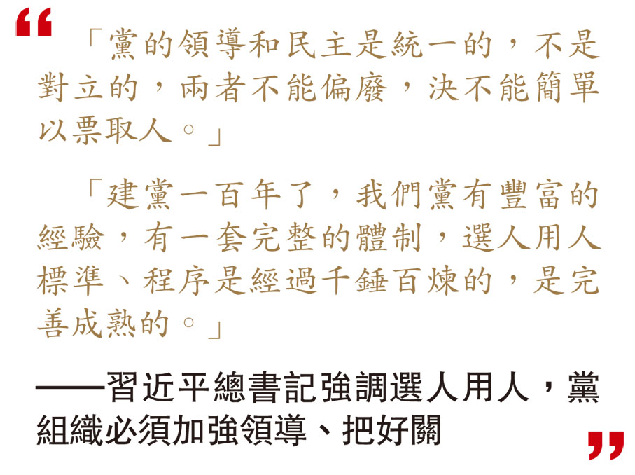 「建黨一百年了,我們黨有豐富的經驗,有一套完整的體制,選人用人標準、程序是經過千錘百煉的,是完善成熟的。」 ——習近平總書記強調選人用人,黨組織必須加強領導、把好關