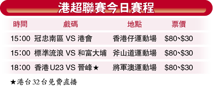 香港文匯報訊(記者 黎永淦)今輪港超聯最後3場賽事同日上演。剛遭逢兩連敗的冠忠南區,返回主場迎戰異軍突起的港會,主帥鄭兆聰希望球員能夠收拾心情重返正軌。上一場聯賽爆大冷不敵港會的標準流浪,再次主場出擊,對手為有一定戰鬥力的和富大埔,可能是今日最具苗頭一仗。香港U23晚上則會遇上晉峰,期望積分榜上能有零的突破。