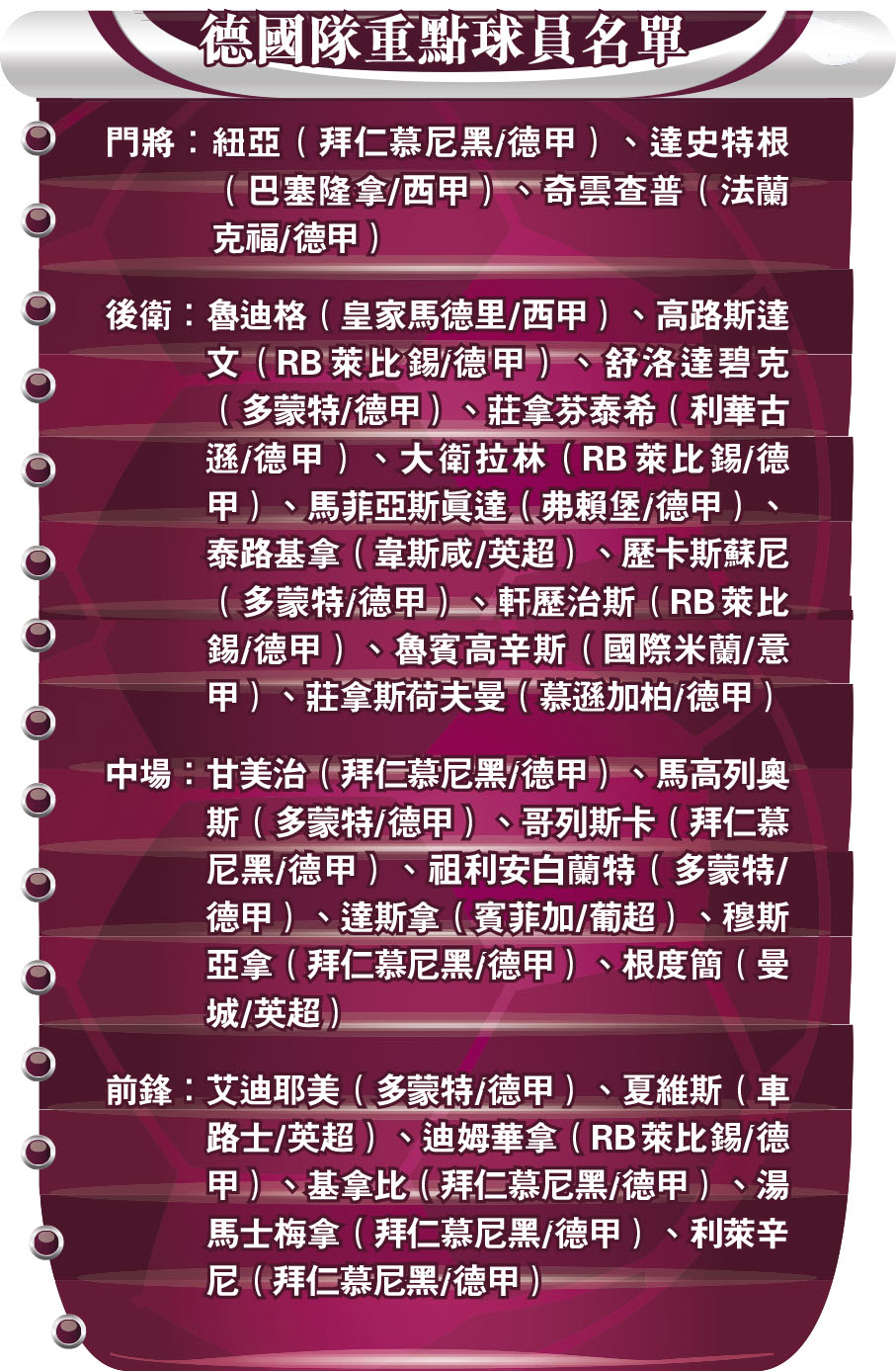 4屆世界盃王者以及3次加冕歐洲國家盃的德國隊,自從2014年勇奪大力神盃後作為足球強隊的霸氣漸失,上屆世盃更爆出小組墊底出局的驚天冷門。進入費歷克時代的「日耳曼戰車」誓要在這趟卡塔爾之旅重拾昔日光輝。球隊重拾勁旅本色,惟在強強對壘中卻依然有穩定性不足的瑕疵,防線經歷換血期以至中鋒位置的短板,或會成為在爭標白熱化階段左右他們登上冠軍頒獎台的重要因素。 ◆香港文匯報記者 梁志達