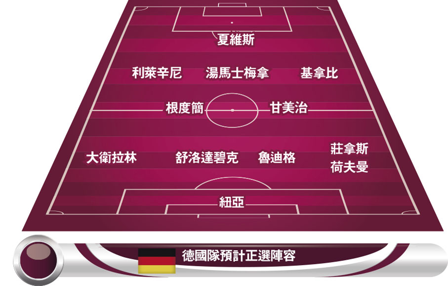 將帥檢閱今年57歲的費歷克球員時代曾効力拜仁慕尼黑,但沒入選過德國大國腳,2019年從助教升任拜仁主帥帶隊橫掃2020年德甲和歐聯在內的6項錦標,成了坐上德足帥位之契機。與路維強調傳控不同,費歷克更傾向快速傳球和壓迫進攻打法,對球員體力和機動性要求甚高,故球隊防守上較易出現漏洞。尤其防線正值新老交替,門將紐亞添新傷入選成疑,僅中堅魯迪格可穩佔正選,近來頗受重用的RB萊比錫左閘大衛拉林和多蒙特中堅新星舒洛達碧克,活力有餘惟大賽還需累積經驗,右閘更似乎尚未找到必然正選,泰路基拿和莊拿斯荷夫曼都是有力競爭者。