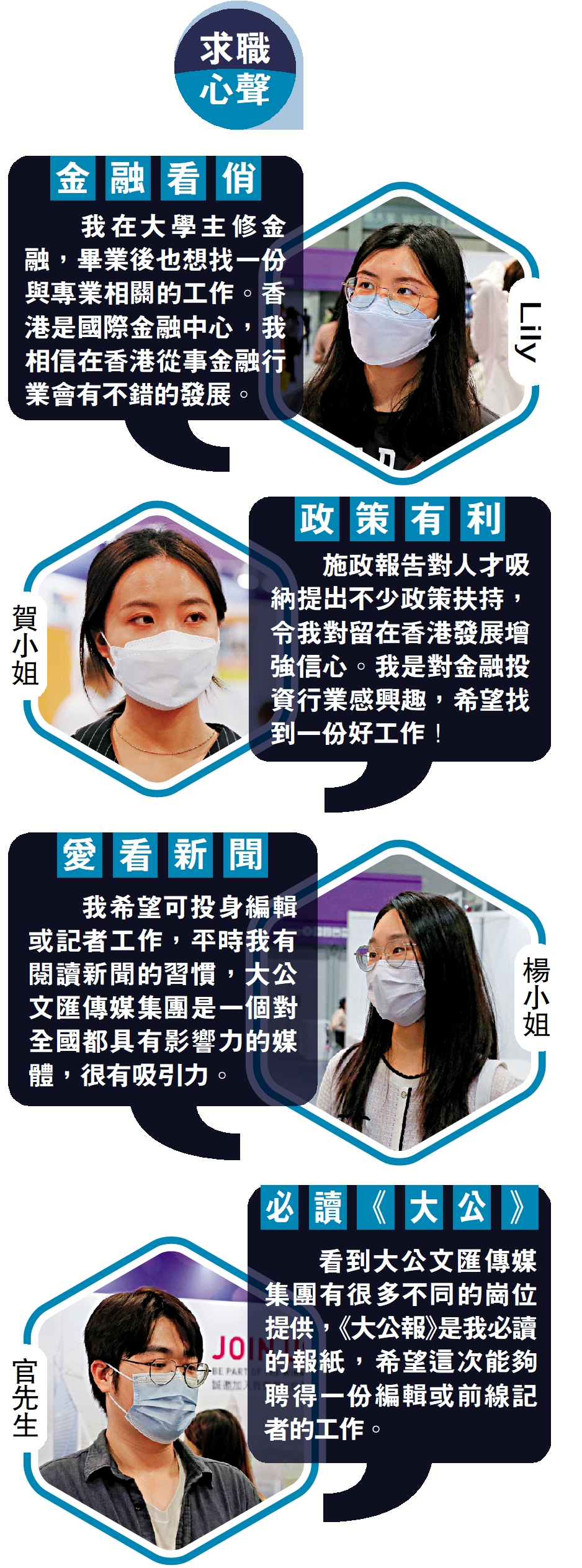 施政報告對人才吸納提出不少政策扶持,令我對留在香港發展增強信心。我是對金融投資行業感興趣,希望找到一份好工作!