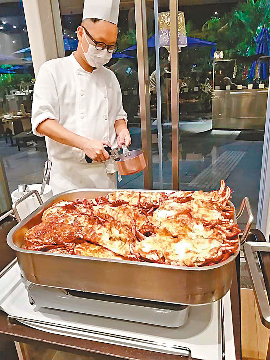 自助餐提供嶄新即製菜式之餘,三款重點菜式登場時更會敲鐘通知全場,倍添氣氛。例如,熟食重頭菜有白蘭地火炙芝士白汁焗龍蝦,飽滿鮮甜的龍蝦鋪上芝士白汁烤至金黃色,由廚師以手推車推出大廳後,再即席澆上白蘭地後點火,視覺效果滿分之餘,香氣四溢。而且,戶外位置設有燒烤炭爐,師傅即席燒製斧頭扒及牛柳,前者肉味濃郁,後者油香豐富,配以濃香的黑松露燒汁,別有風味。而凍廚房供應的即切油甘魚刺身則甘甜肥美,搭配清新的紫蘇青醬更能帶出魚的鮮味;壽司卷加上柚子蛋黃醬,酸甜不膩。