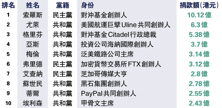 今屆中期選舉選情激烈,金主們為支持心儀的候選人,斥巨資助選絕不手軟。研究機構OpenSecrets匯集政治獻金數據指出,單是捐款額最多的10名超級金主,便合共斥資5.4億美元(約42.3億港元),其中「國際金融炒家」索羅斯是唯一捐款逾1億美元的金主。