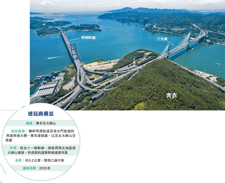 香港特區政府近年着力發展新界西北,包括洪水橋/厦村新發展區及元朗南發展等,為應對未來交通基建需求,正計劃興建青衣至大嶼山連接路,目標是2033年或之前通車。路政署工程管理負責人昨日透露,該連接路配合「北部都會區」及「明日大嶼」等大型發展,以及有助紓緩屯門公路塞車問題,今次提出的走線方案比約10年前的初步研究,建造時間較短。惟目前仍於前期研究階段,故未能估算造價,日後是否要收費亦言之尚早。 ◆香港文匯報記者 文森