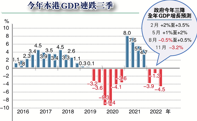 政府昨指出,外圍環境惡化,加上跨境陸路貨運往來持續受阻,對香港的出口造成沉重打擊。儘管疫情大致穩定、勞工市場情況改善及政府在8月份發放消費券為私人消費帶來支持,但主要央行大幅加息令金融狀況收緊,嚴重影響內部需求,本地生產總值繼第二季按年收縮1.3%後,在第三季再下跌4.5%。經季節性調整後按季比較,實質本地生產總值下跌2.6%。首三季合計,本地生產總值按年下跌3.3%。