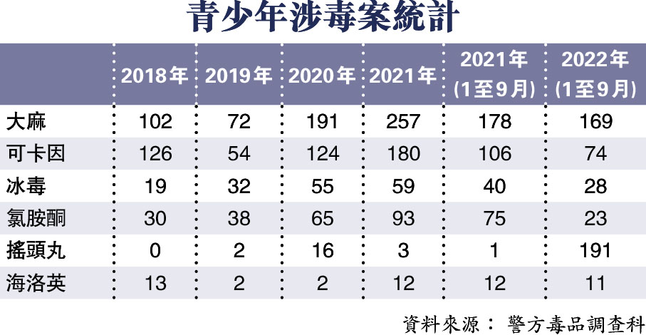 今年首9個月,警方錄得2,368宗毒品案件,拘捕超過2,500人,其中21歲以下有361人。雖然較去年同期有減少,但平均每月有40名青少年被捕,較前兩年每月約20人升一倍。