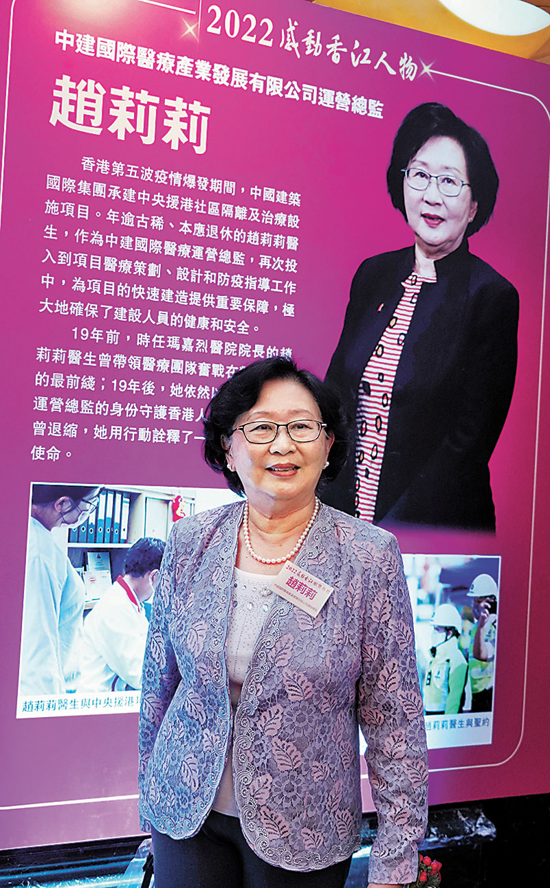 為抗擊香港新冠肺炎第五波疫情,在不到一個月時間,中央第一階段援建香港的6處方艙全部交付,共提供約2萬張床位,中國建築國際集團作為方艙項目的承建方。年逾古稀、本應退休的趙莉莉醫生,作為中建國際醫療運營總監投入到項目醫療策劃、設計和防疫指導工作中,為項目的快速建造提供重要保障,極大地確保了建設人員的健康和安全。