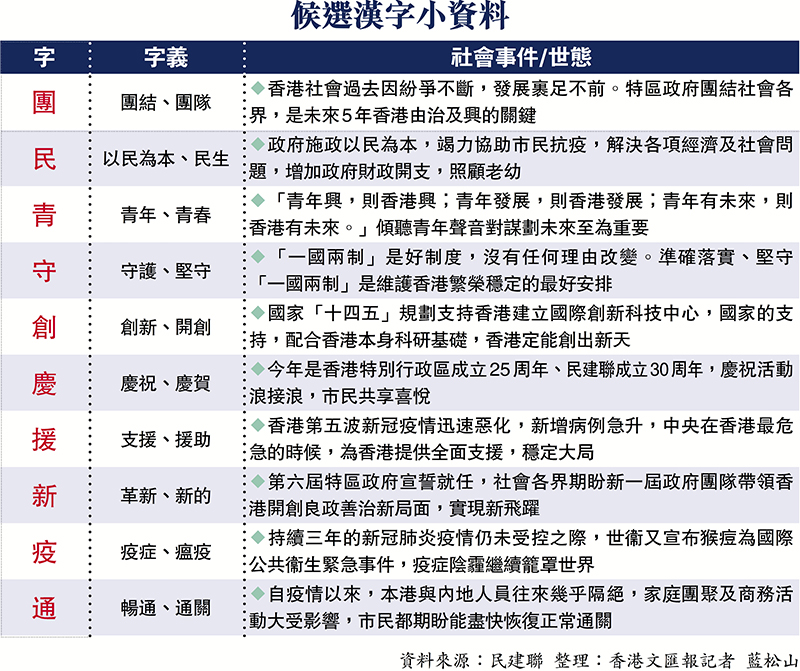 香港文匯報訊(記者 藍松山)今年是民建聯成立30周年,民建聯舉辦一系列慶祝活動。民建聯宣傳及公關委員會昨日公布其中一項焦點活動「香港年度漢字評選」,市民可於今日(19日)至下月22日期間,透過民建聯「微信公眾號」在評審委員會選出的10個候選漢字中,選出一個最能夠代表對2022年感受或社會狀況的「年度漢字」。今年10個候選漢字為「團」、「民」、「青」、「守」、「創」、「慶」、「援」、「新」、「疫」、「通」(見表)。