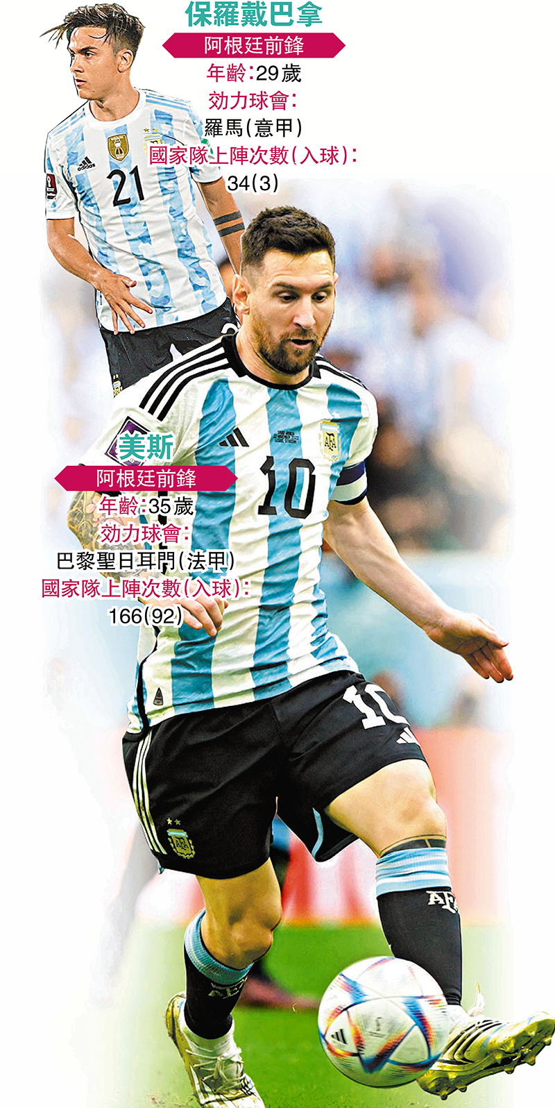 事實上,阿根廷隊可用之兵極少,主帥史卡朗尼是役可作變動自然不多,讓擅長於後場組織的中堅利辛度馬天尼斯出任正選,增強後場組織力已是其一選擇;至於首戰未獲派上陣的保羅戴巴拿則可能是史卡朗尼的後備武器,這位羅馬鋒將今季於球會賽事表現出色,卻因傷直至本月13日才復出替羅馬後備上陣,甫上場便極速助球隊改變戰局,賽後更獲羅馬名帥摩連奴大讚,這位創造力和射術兼備的球員隨時可成為阿根廷隊爭勝關鍵。