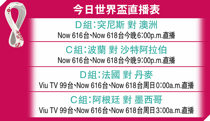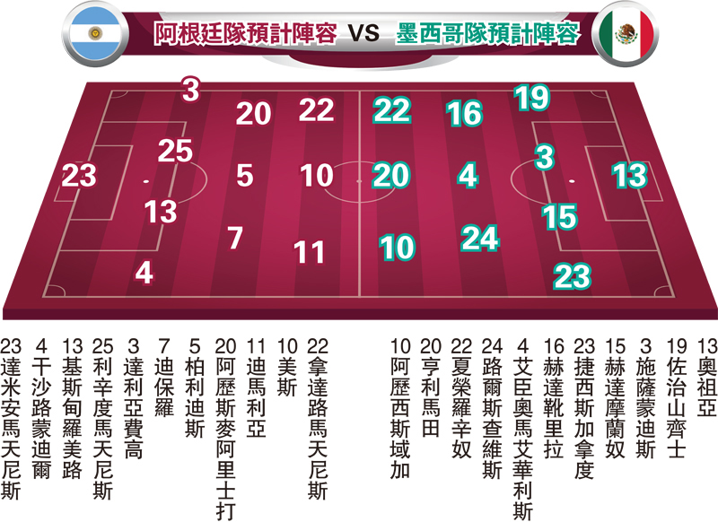 在首場世界盃分組賽慘遭滑鐵盧的阿根廷隊,將於香港時間27日凌晨再度登場,在盧塞爾體育場出戰對墨西哥隊的C組次輪比賽。從首輪賽事所見,除了「球王」美斯外,阿根廷隊始終欠缺一位可以改變戰局的球員,是役面對反擊能力不俗的墨西哥隊,隨時會再次遇上麻煩。(Viu TV99台、Now616及618台周日3:00a.m.直播)。 ◆香港文匯報記者 楊浩然