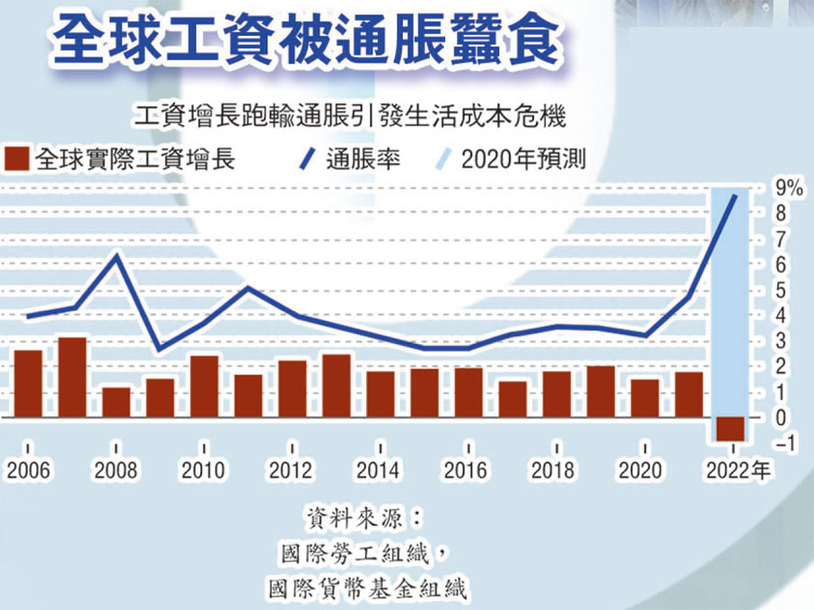 在俄烏衝突引發能源短缺危機,導致全球能源價格飆升,以及美國聯儲局等多國央行的加息潮下,令全球通脹持續加劇,美國和英國等國家的通脹率均升至數十年來高位,國際貨幣基金組織(IMF)預計今年底全球通脹率將達到8.8%,加上供應鏈瓶頸及全球經濟增長放緩等多重危機,令低薪員工持續面臨生活成本上漲的衝擊。ILO報告指出,今年上半年扣除物價因素的全球平均工資,較去年同期下降0.9%,「這清楚表明許多國家今年上半年名義工資的調整幅度,不足以抵消生活成本的上漲」,意味全球生活水平首次出現明顯下降。
