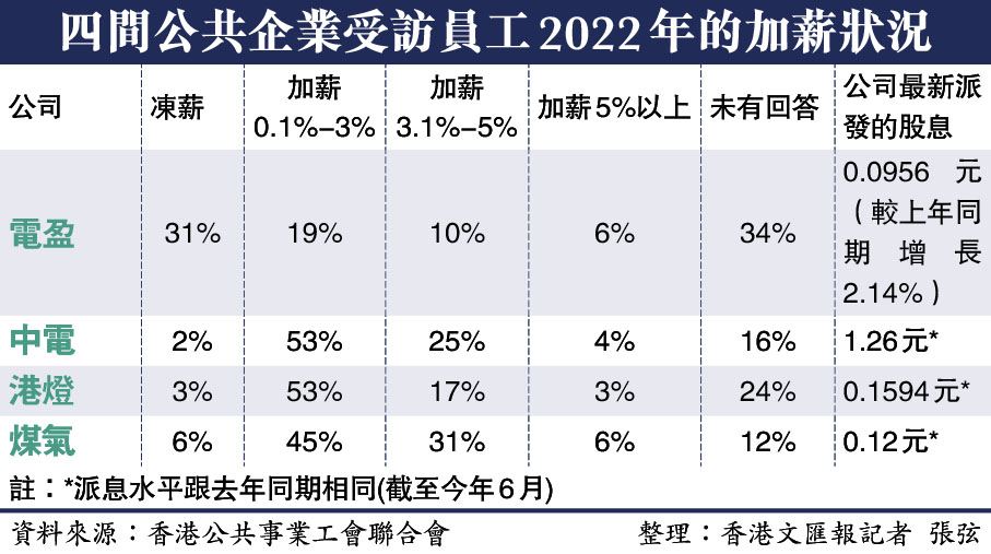 香港電費、煤氣等各項公共事業逆市下陸續大幅加價,但有關公司被質疑「肥上瘦下」的情況嚴重。一項由工會主導的調查發現,港燈、中電、煤氣及電盈4間公共事業,在新冠肺炎疫情下,向股東派發的股息沒有減少,甚至有所增加,但對股東慷慨的同時,辛勞付出的僱員工作量不但加重,待遇亦未見明顯改善。調查發現,該4間企業僅38%受訪員工今年獲加薪1%至3%,跑輸通脹,更有職員20年以來一直「凍薪」,用20年前的薪酬應對今時今日的通脹十分吃力。逾半數受訪員工期望明年獲加薪5%以上。工會建議公共事業下年度向員工加薪不少於6.5%,並期望特區政府監督公共企業在加價後,保障員工合理權益,讓僱員也能分享經濟成果。◆香港文匯報記者 張弦