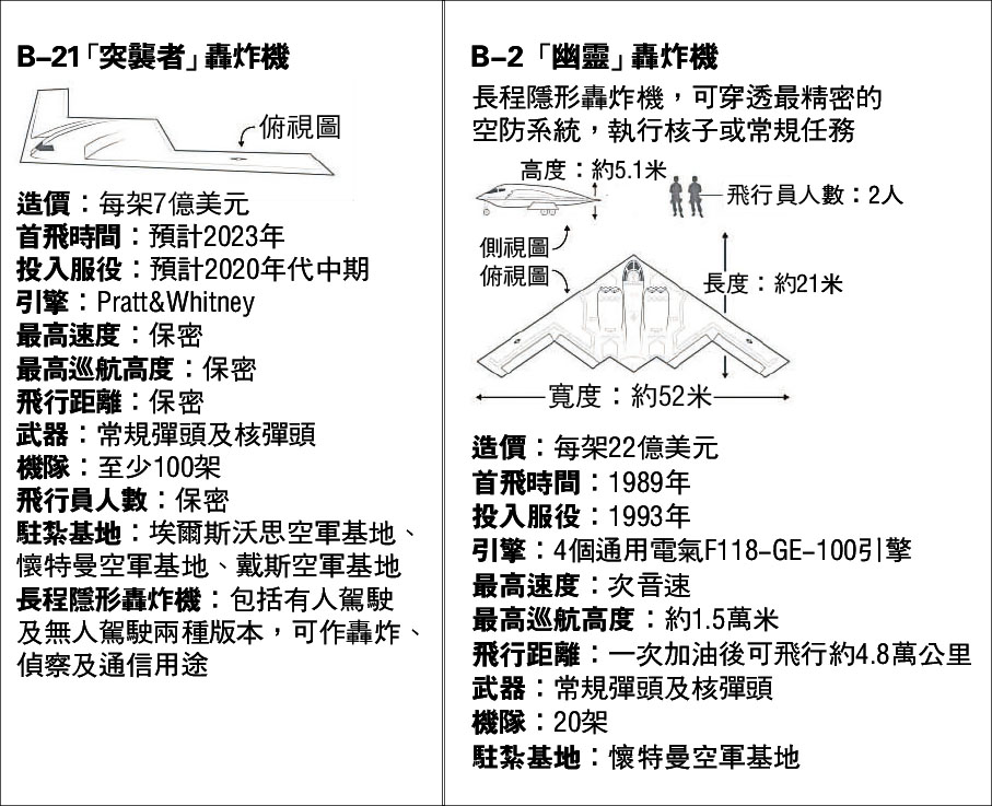 《華爾街日報》報道,B-21外形近似B-2但略小,每架平均造價約7億美元(約54.5億港元),可避開最先進防空系統偵測,打擊敵方目標。負責研發的美國軍工巨企諾斯洛普格拉曼表示,B-21可攜常規武器與核武,最終還可發展為具無人飛行的能力。