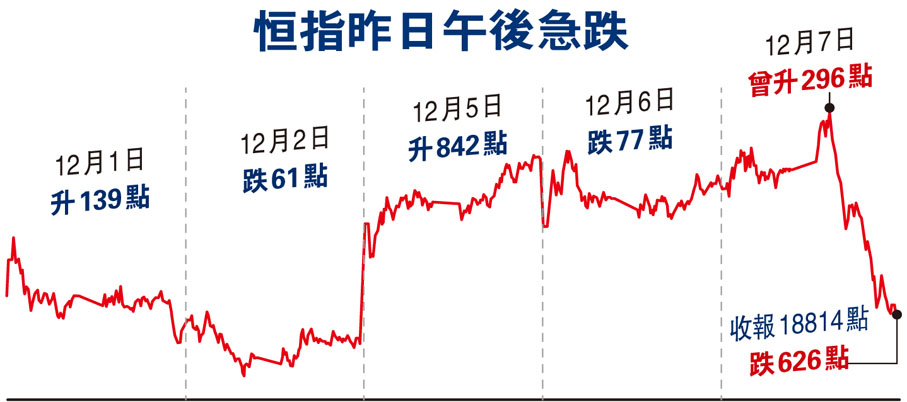 內地進一步優化防疫措施及中央政治局會議定調明年經濟工作,消息利好昨日港股曾一度升近300點,惟下午內地公布10月份外貿數據,進出口表現都差過預期,反映國內國外需求依然疲弱,港股反覆回落,收市跌626點,報18,814點,成交2,078億元,「北水」轉為淨流出50億元,是兩周來最多。經濟師亦指出, 隨着內地調整防疫政策,疫情可能出現反彈,部分防疫措施或不會太快取消;不過,中央的工作重點轉向促經濟增長,相信明年內地經濟會大幅反彈,總體有利港股後市。 ◆香港文匯報記者 周紹基