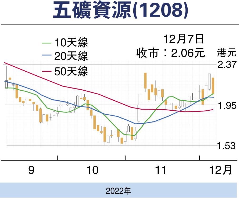 隨着秘魯銅項目生產恢復及內地疫情防控放鬆帶動經濟復常,新能源基建擴大,銅需求回升,有利業績改善。昨天股價跟隨大市回調,收報2.06元元,急跌9.25%,成交7,700萬元。股價回落至10天及20天線水位,而50天線在1.90元水平,2元或以可作為近期急升後回調吸納區,反彈目標2.60元,跌穿1.90元止蝕。