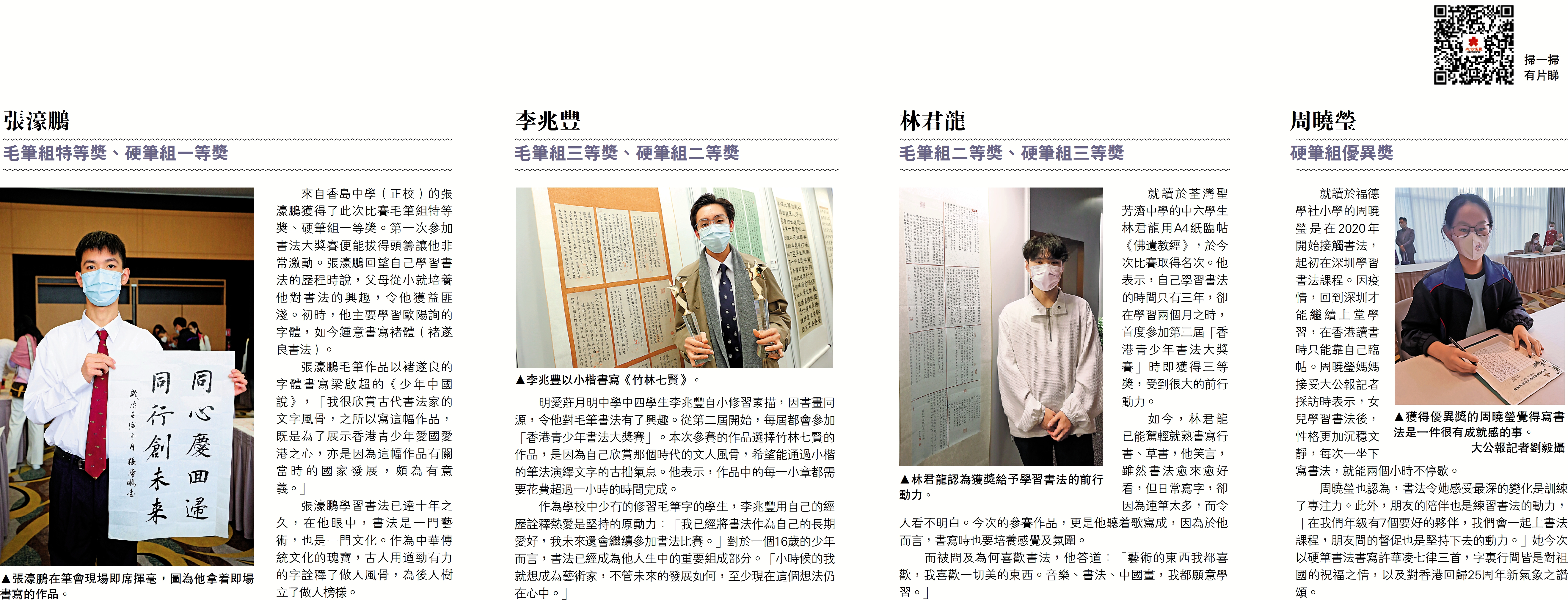 來自香島中學(正校)的張濠鵬獲得了此次比賽毛筆組特等獎、硬筆組一等獎。第一次參加書法大獎賽便能拔得頭籌讓他非常激動。張濠鵬回望自己學習書法的歷程時說,父母從小就培養他對書法的興趣,令他獲益匪淺。初時,他主要學習歐陽詢的字體,如今鍾意書寫褚體(褚遂良書法)。