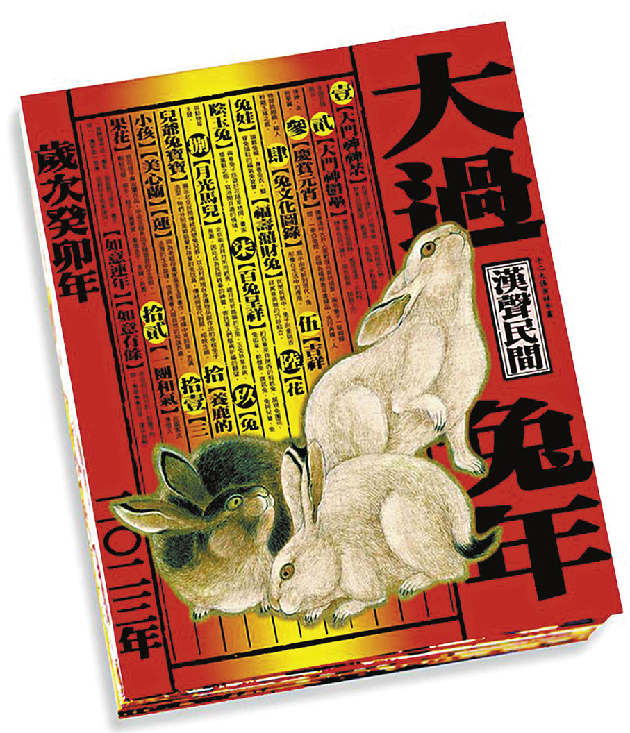 《大過兔年》是一本特別的海報書,包含了過年相關的吉祥文化和生肖兔文化。四川綿竹的門神《神荼》、《鬱壘》,全副武將裝扮,色彩鮮明,別具地方特色。天津楊柳青年畫《慶賞元宵》描繪「正月十五鬧元宵」的歡樂情景。童子門神《如意連年》、《如意有餘》祝福大家吉祥如意,年年有餘。江蘇桃花塢年畫《一團和氣》是流傳久遠的圖案,祝賀新年和氣愉快。《兔文化圖錄》展示史前至今,兔子形象在生活中的應用,見證了十二生肖中排行第四的兔子在歷史長流中的文化意義。剪紙作品中,《吉祥兔娃》是一個戴兔帽、着兔衣、穿兔鞋的福氣兔寶寶,呈現玉兔作為兒童保護神的角色。《福壽囍財兔》來自山東高密,兔形象與吉祥美意的表現巧妙結合。《百兔呈祥》是陝西的百隻剪紙兔,可見兔銜草、蛇盤兔、鷹抓兔、兔與兒童、兔與動植物等主題。《三果花》是剪花娘子庫淑蘭的作品,一樹結石榴、佛手、桃子三種果實,傳達着多子、幸福、長壽的祝福。《花陰玉兔》是北宋劉永年的繪畫,一白一灰兩兔悠遊於花陰草地,觀者可體會其中的消閒自適、平和自身心態,迎接新一年的生活。《養鹿的小孩》、《美心蘭》、《蓮》同為老祖母畫家吳李玉哥的畫作,充滿活潑的生命旋律。當下新冠疫情仍在全球肆虐,與之相應還有執掌治病、長壽的月宮玉兔。《月光馬兒》是北京明清時期拜月所用玉兔神像。《兔兒爺兔寶寶》中有傳統北京泥塑兔兒爺,在今日它們也同樣寄託着人們驅病祈福的願望。與兔兒爺對照呈現的,是利用身邊物品創作的多姿多彩兔子造型,創意十足,且提示了環保概念。兔子溫和文雅又行動迅速,撫慰人心,也給人行動的力量。讀《大過兔年》,祝福大家動若脫兔,步步高陞!
