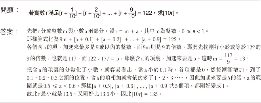 這次的題目談[x]這個符號,意思就是小於或等於x的最大整數,稱為取整函數,比如[13.4] = 13,[11] = 11,或者[-1.2] = -2之類。這個直接運算是挺簡單的,若果要解方程,解些未知數出來,就有點難,初時看着符號陌生,也未必想得到有什麼好方法。這個讀者可以試一試。