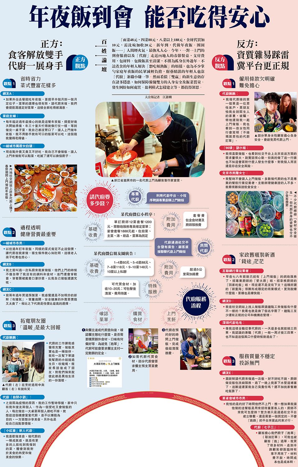「兩菜48元,四菜88元,八菜以上188元,食材代買加10元,需洗碗加收20元。新年到,代做年夜飯﹑團圓飯……」人間煙火氣,最撫凡人心。今年,一對一上門的到會服務以及「代廚」走近內地人的春節餐桌,支付費用,包材料、包做飯甚至清潔,不僅為孤身在外過年、不諳煮食的年輕人解決「想吃頓熱飯」的煩惱,也為不少掌勺家庭年夜飯的民眾減輕負擔,廚藝精湛的年輕人也靠「代廚」兼職小賺一筆。然而看似「雙贏」的新生意仍存在諸多隱患,如何保障僱傭雙方的人身安全及飯菜質量、發生糾紛如何處置、盈利模式怎樣建立等,都值得深思。\大公報記者 江鑫嫻