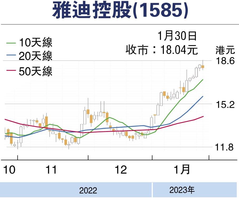 本地旅遊復甦及內地經濟重啟,加上美國加息步伐開始放緩,港股1月份氣勢如虹,外資接連唱好港股,推動恒指突破二萬二千點水平。不過,大市短期或要進入盤整階段,資金轉而繼續在不同板塊之間流動,當中可留意雅迪控股(1585)。