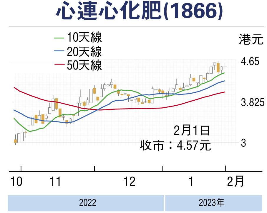 化肥化工板塊在近日調整市中有較佳表現,化肥龍頭股之一中國心連心化肥(1866)近期利好消息頻傳,其江西化工廠二期DMF項目上月中投產,並獲評定為國家高新技術企業享優惠稅,而主業化肥續受惠全球糧價上漲,盈利前景樂觀,可續留意。