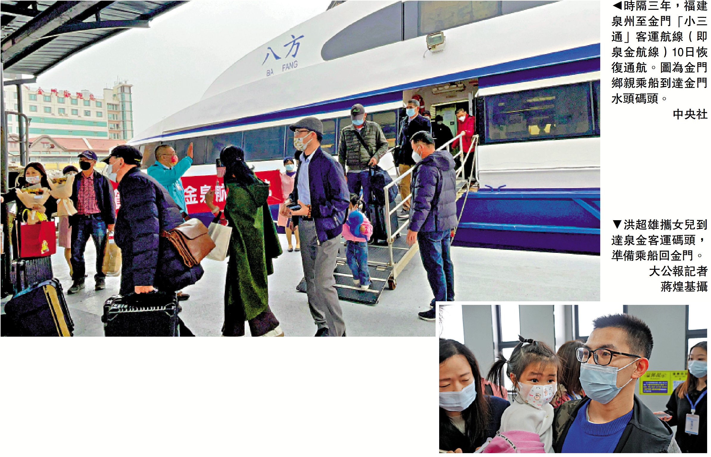 繼廈金、福馬航線1月初復航後,中斷三年的泉州至金門的「小三通」客運航線(即泉金航線)10日起恢復通航。金門鄉親洪超雄現場掩飾不住興奮,「女兒1歲在金門打完疫苗回到泉州後,『小三通』就中斷了,現在女兒4歲了,小傢伙已經三年沒回金門了。」有台商表示,目前廈金、福馬、泉金航線只是有限復航,與廣大台胞期盼還有很大差距,希望民進黨當局再放寬搭乘資格,讓台商盼回家路更便利。/大公報記者 蔣煌基泉州報道