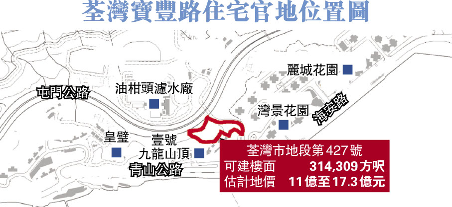地政總署表示,寶豐路住宅地皮收到10份標書。該地鄰近灣景花園、翠濤閣及卓能集團旗下壹號九龍山頂,地盤面積約9萬方呎,最高樓面可達31.43萬方呎。相關樓面不包括將由買方按照賣地條件所興建的設有30個宿位的弱智人士輔助宿舍之政府設施樓面。項目發展期止於2028年12月31日。